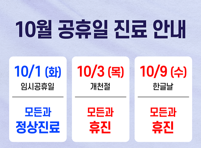 각 월별 공휴일에 따라 병원의 진료 스케줄도 달라집니다. 예를 들어, 10월 1일에는 모든 서비스가 운영되지만, 10월 3일과 10월 9일에는 모든 서비스가 중단됩니다. 이러한 정보는 각 병원의 공식 홈페이지나 전화 문의를 통해 미리 확인할 수 있습니다.
