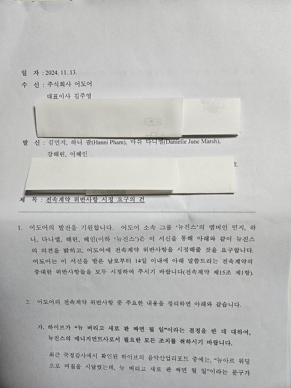 [1] 한겨레 - 뉴진스, 어도어에 “시정 요구 불응시 전속계약 해지” 내용증명 (https://www.hani.co.kr/arti/culture/culture_general/1167275.html)