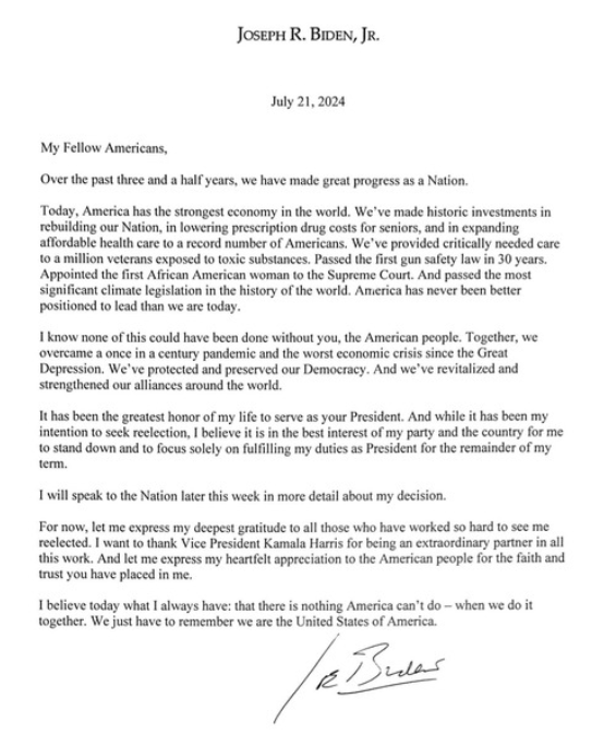 바이든 대통령은 성명을 통해 “재선에 도전하는 것이 내 의도였으나 (후보에서) 물러나서 남은 임기 동안 대통령으로의 의무를 다하는데만 집중하는 것이 당과 국가에 최선의 이익이라고 믿는다”고 밝혔다. 그러면서 “내 결정에 대해 금주 후반에 더 구체적으로 국민들에게 설명할 것”이라고 전해졌다..