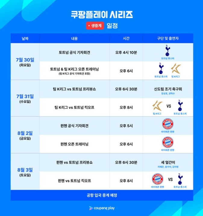 .쿠팡플레이 시리즈 중계는 세계적인 선수들의 대한민국 입국 현장부터 시작한다. 토트넘의 주장 손흥민을 포함해 제임스 메디슨, 데얀 쿨루셉스키 등 선수들의 입국 장면을 실시간으로 전한다. 이후 뮌헨의 ‘괴물 수비수’ 김민재를 비롯해 토마스 뮐러, 주앙 팔리냐 등 선수들의 입국 장면도 담을 예정이다.