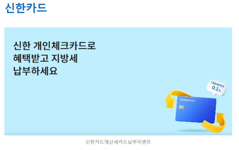 - 이벤트 내용 : 신한 체크카드로 지방세 납부시 0.1% 캐시백