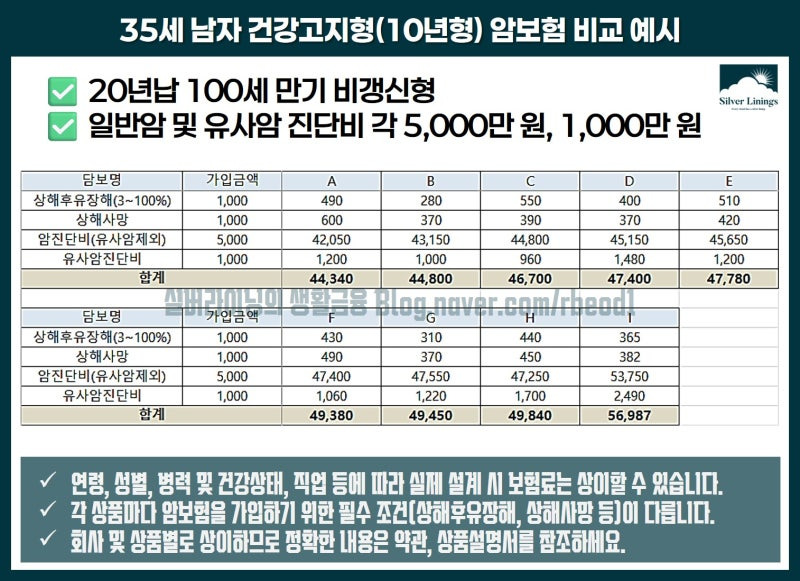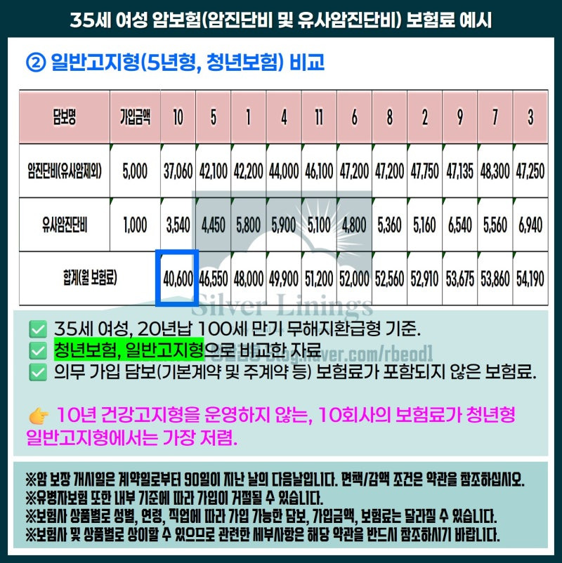 에서 보듯이, 다양한 보험료를 비교해보는 것이 중요합니다. 예를 들어, 35세 여성의 경우 일반 보험과 청소년 보험의 보험료를 비교해보면, 보장 금액에 따라 보험료가 다르게 책정됩니다. 이러한 비교를 통해 자신에게 맞는 최적의 상품을 선택할 수 있습니다.